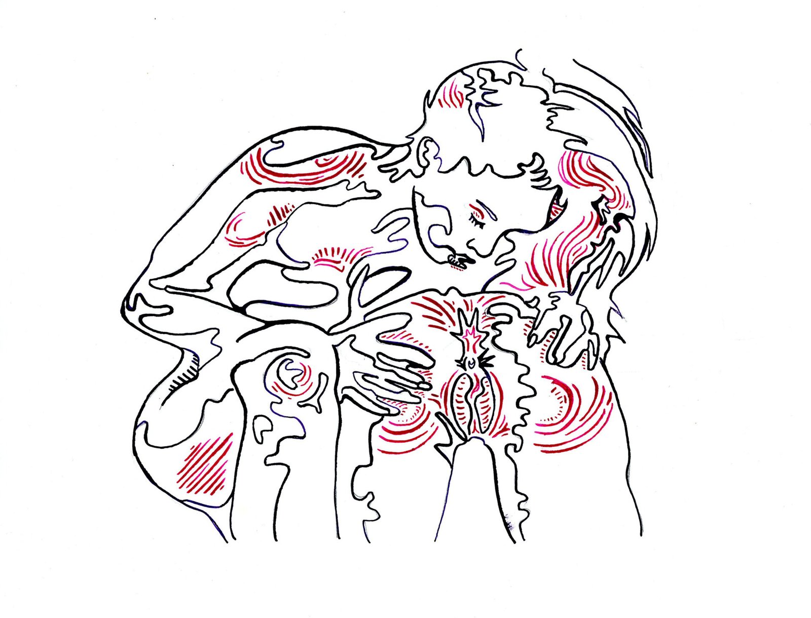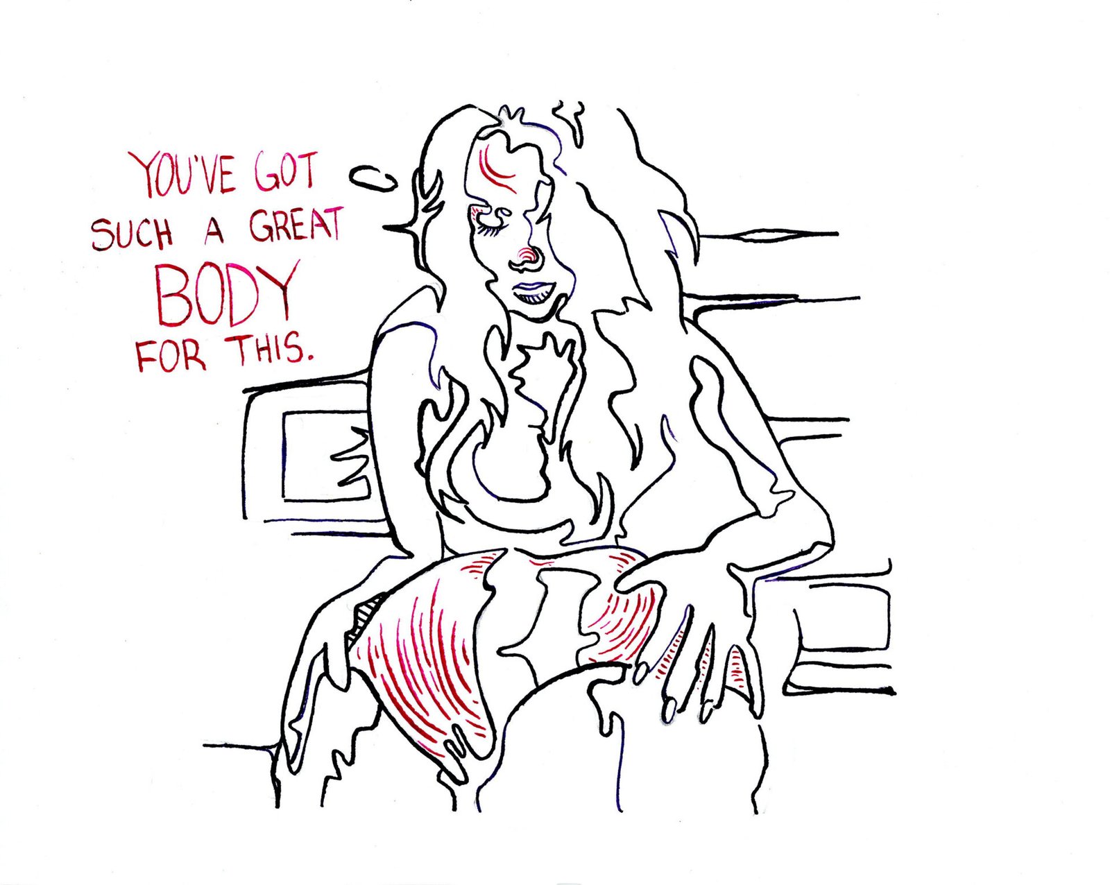 My first weekend of yoga teacher training, I think it was fair to say that I spent equal parts of My time training in the yoga studio and in independent study (aka searching for and watching yoga related pornography). A particular favorite of mine was of Daisy Marie and Laly’s hot private session. I sent a link to Mistress Margot Rose, and she created a handful of drawings for Me based on the video. I framed one of Daisy Marie inspecting Laly’s body in down dog. The quote, “You’ve got such a great body for this” accompanies the figures on the page.